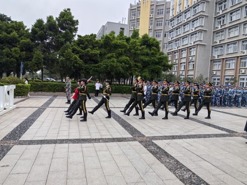 国旗护卫队迈着铿锵有力的步伐,庄严护送国旗至升旗台。在激昂的《义勇军进行曲》中,鲜艳的五星红旗冉冉升起。全体师生行注目礼,高唱国歌,铿锵歌声回荡广场,爱国情怀涌动心间。