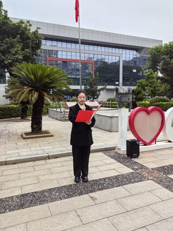 仪式中,员工代表社体242班孙颢桐作了题为《血色黎明中的绝笔》的主题演讲。他动情讲述了赵云霄夫妇两位早期中共党员,于1928年被捕并先后英勇就义的事迹。在牺牲前夕,赵云霄在狱中生下女儿启明,并写下了一封感人至深的绝笔家书。这封家书字字千钧,承载着革命者舍小家为大家的坚定信仰与深沉家国情怀,深刻展现了共产党人为民族解放和人民幸福不惜牺牲一切的崇高精神。