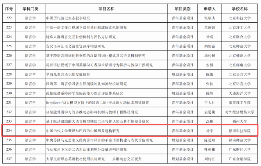 本网讯:9月25日,教育部社会科学司正式公布2025年度教育部人文社会科学研究一般项目评审结果。yl6809永利官网yl6809永利官网葡萄牙语专业教师杨宇申报的《中国当代文学葡译与巴西的中国形象建构研究》成功获批青年基金项目。