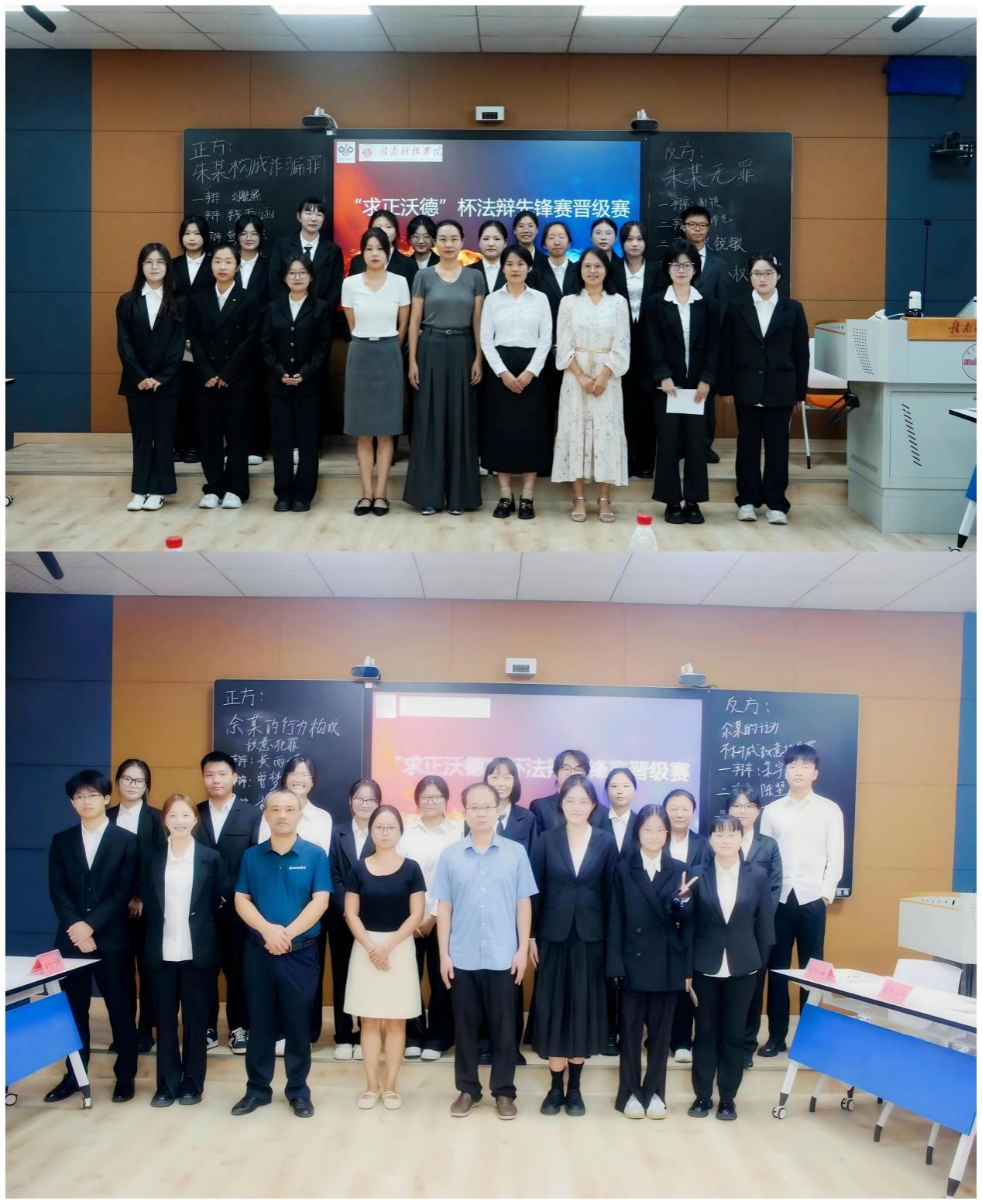 本次晋级赛从筹备策划、辩题打磨到现场评审,全程贯穿校企深度合作理念,不仅保障了赛事专业水准,更为后续四强赛、决赛积累了成熟经验。合作方江西求正沃德(赣州)律师事务所充分发挥实务资源优势,派出万秀平律师、谢嘉美律师、钟洁律师组成专业评审组,与yl6809永利官网yl6809永利官网法学教研室温美芬老师、龚云辉老师、欧阳东老师共同构建“实务+理论”双轨评委团,这种校企联合评审模式将持续应用于后续的赛事环节当中。