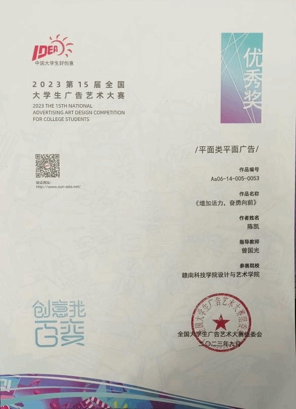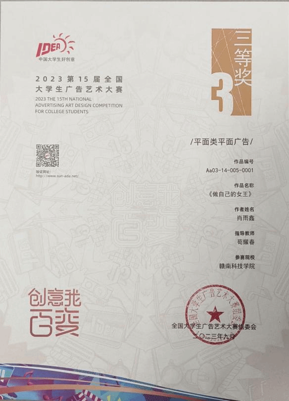 2023年第十五届全国大员工广告艺术大赛比赛成绩揭晓,在公布的获奖名单中,视觉传达设计专业师生成绩斐然、硕果累累。在选送的30件作品中我院共计获得12个奖项,其中肖雨鑫同学的作品获得全国三等奖,王雨惠同学作品获得江西省一等奖,其它获奖作品分获二等奖3项,三等奖6项。