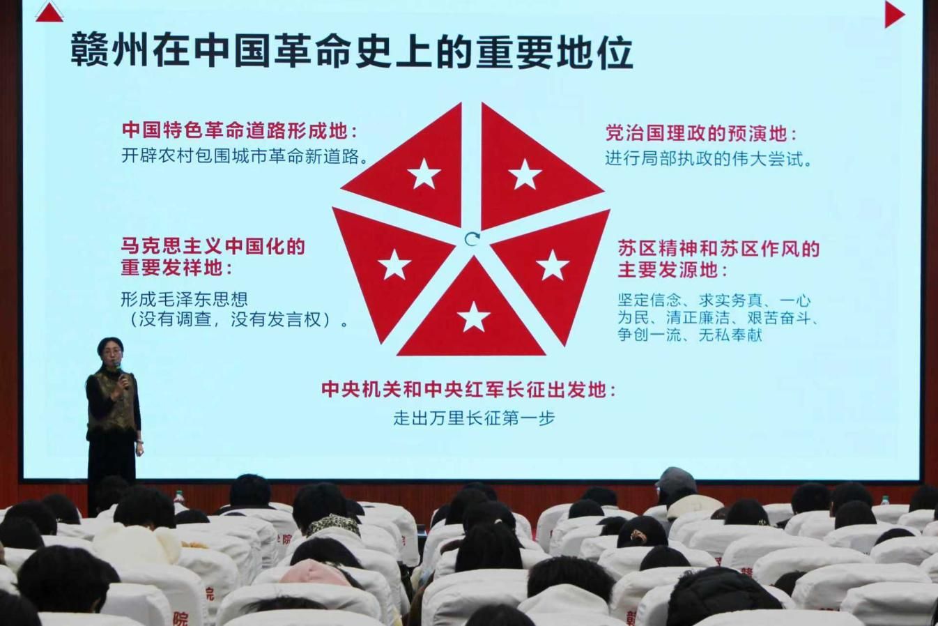 讲座中,曾键从赣州2200多年的建城历史讲起,围绕“红色故都”“江南宋城”“客家摇篮”“世界橙乡”四张核心名片展开讲述。她生动回顾了中央苏区的革命历程,阐释了苏区精神的深刻内涵;介绍了赣州古城墙、福寿沟等宋代遗迹的历史价值;讲述了客家先民南迁的艰辛与智慧,以及赣南脐橙作为地方特色产业的发展优势。丰富的史实资料与鲜活的案例结合,使师生们沉浸式感受到赣州深厚的历史底蕴与多元文化魅力。